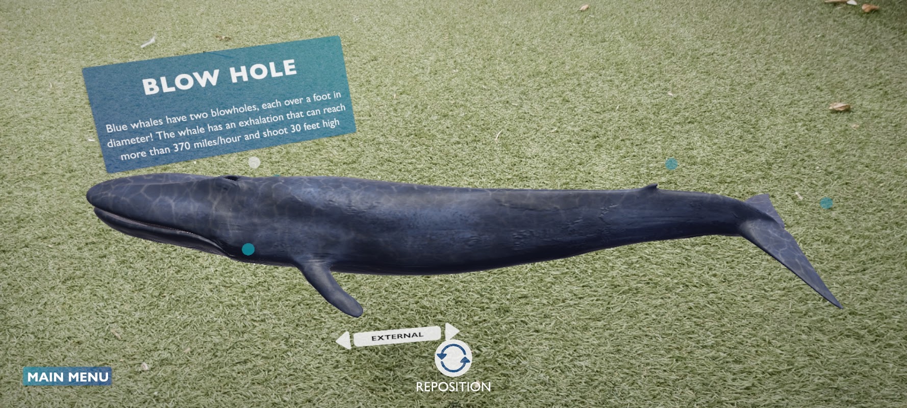"मॉडल व्यू" आपको व्हेल के साथ आमने-सामने लाता है, एक 3डी प्रस्तुति पेश करता है जिसे आप स्थिति और एक्सप्लोर कर सकते हैं। खेलने के लिए एक सतह खोजें, फिर व्हेल को अपनी दुनिया में लाने के लिए उस पर टैप करें। अब तक के सबसे बड़े जानवर की बाहरी, कंकाल और आंतरिक संरचनाओं का पता लगाने के लिए ऑन-स्क्रीन परत चयनकर्ता का उपयोग करें। प्रत्येक परत में नीले हॉटस्पॉट होते हैं जो रुचि के उस क्षेत्र के बारे में प्रासंगिक जानकारी पॉप-अप करते हैं। आप व्हेल के आकार को बड़ा और छोटा करने के लिए बदल सकते हैं, या बेहतर दृश्य के लिए इसे घुमा भी सकते हैं। साहसिक लग रहा है? व्हेल को उसके पूरे आकार में फैलाने के लिए अपनी उंगलियों का उपयोग करें। बस सुनिश्चित करें कि आपके पास पर्याप्त जगह है!