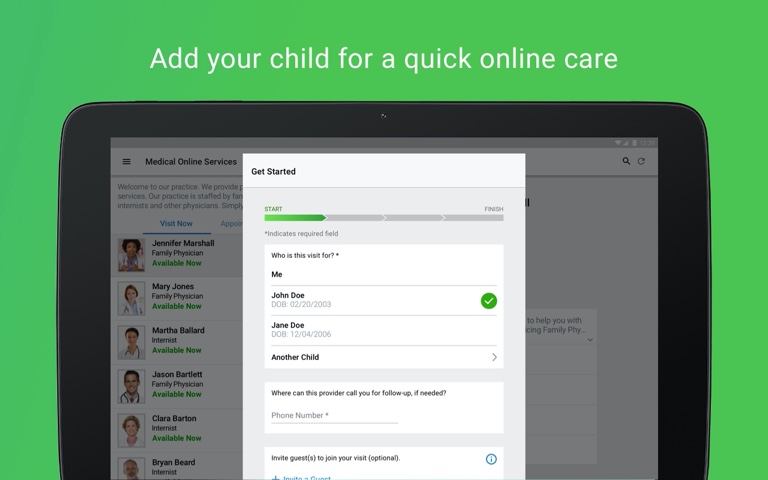 कभी भी, कहीं भी एक डॉक्टर को देखें। कहीं भी ब्लूकेयर के साथ, एरिज़ोना (बीसीबीएसएज़) के ब्लू क्रॉस ब्लू शील्ड के सदस्य मोबाइल डिवाइस पर एक बोर्ड-प्रमाणित चिकित्सक, परामर्शदाता या मनोचिकित्सक देख सकते हैं। यह किसी भी दिन, किसी भी समय तत्काल देखभाल पाने का सबसे आसान तरीका है। बेहतर महसूस करने के लिए इंतजार क्यों करें! बस साइन इन करें और अपनी लाइव वर्चुअल यात्रा से जुड़ें। सभी डॉक्टर औसतन 10-15 साल के अभ्यास में प्रमाणित होते हैं।