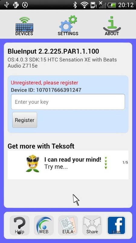 IMPORTANT: Samsung Galaxy phones and some HTC Models do not support Bluetooth L2CAP, needed for Blueinput to open a connection to your bluetooth keyboard or mouse. Please do not under rate Blueinput for something that is beyond our control. We have provided this software for free, investing a lot of our time into making something useful!