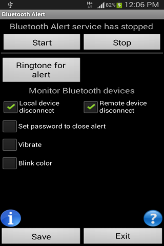 To configure, set Ringtone for alert, select you want to be notified when local Bluetooth or remote Bluetooth device disconnect and tap Save. Finally remember to tap Start to start the service.