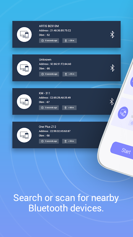- आप आस-पास के ब्लूटूथ डिवाइस को स्कैन कर सकते हैं और यह अपने डीबीएम के साथ मीटर में डिवाइस की दूरी भी प्रदर्शित करता है।