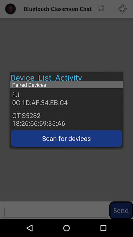 Bluetooth Classroom Chat is a simple application for chatting inside a college premises,classroom , library etc. It uses a simple bluetooth connection to chat with users.