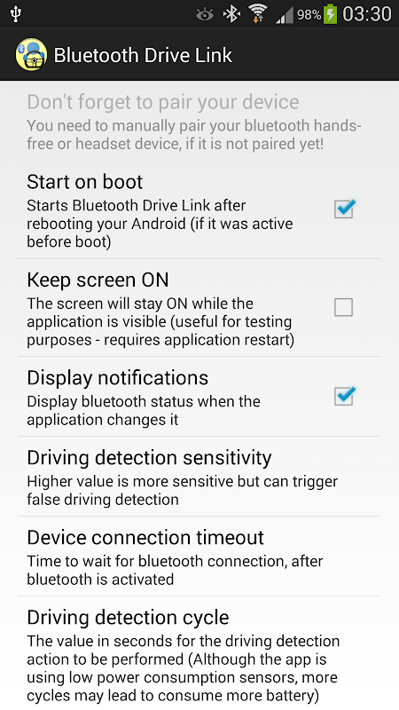 ब्लूटूथ ड्राइव लिंक आप से दूर कर देते हैं और इसे छोड़ जब आप अपने वाहन चला रहा था और इसे अक्षम कर रहे हैं, जबकि इसे सक्रिय करने के लिए आप अपने फोन के ब्लूटूथ राज्य का प्रबंधन करेगा कि एक छोटे app है।