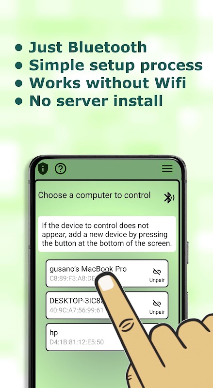 कुछ ही सेकंड में अपने फ़ोन को ब्लूटूथ के माध्यम से अपने कंप्यूटर से जोड़ें। हमारे सर्वर रहित कनेक्शन का मतलब है कि किसी अतिरिक्त इंस्टॉलेशन की आवश्यकता नहीं है। वाई-फ़ाई की आवश्यकता नहीं है.