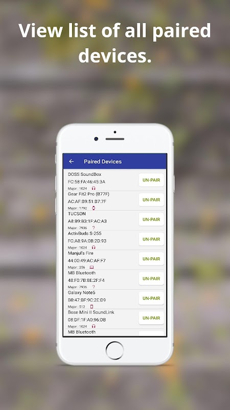 - कनेक्टेड, युग्मित, अज्ञात और श्रवण यंत्र सहित सभी ब्लूटूथ डिवाइस ढूंढें।
