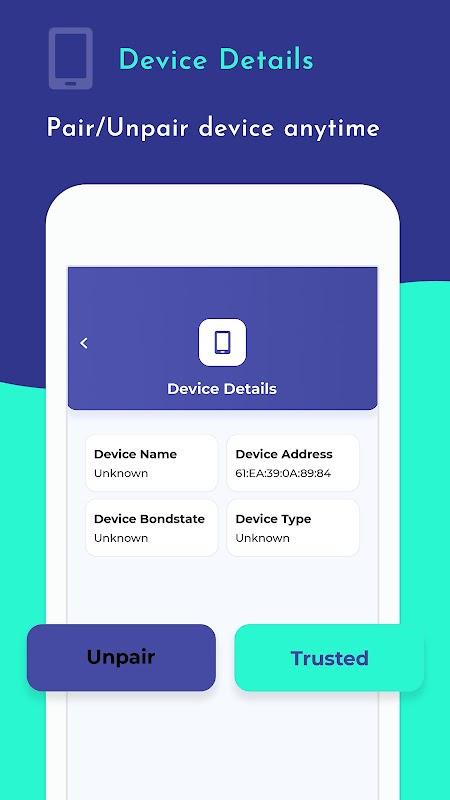 - वक्ताओं, हेडसेट या घड़ी के अपने युग्मित उपकरणों की तरह केवल अपनी विश्वसनीय डिवाइस सूची प्राप्त करें। इस एप्लिकेशन का उपयोग करके केवल विश्वसनीय उपकरणों से कनेक्ट करें।
