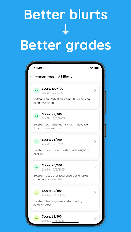 आप अपने पिछले ब्लर्ट देख सकते हैं, समय के साथ अपनी प्रगति ट्रैक कर सकते हैं, और देख सकते हैं कि हर कोशिश के साथ आपकी समझ कैसे बेहतर होती है. चाहे आप स्कूल, परीक्षा या जीवन भर सीखने के लिए पढ़ाई कर रहे हों, ब्लर्ट आपको ज़्यादा याद रखने और ज़्यादा प्रभावी ढंग से पढ़ाई करने में मदद करता है.