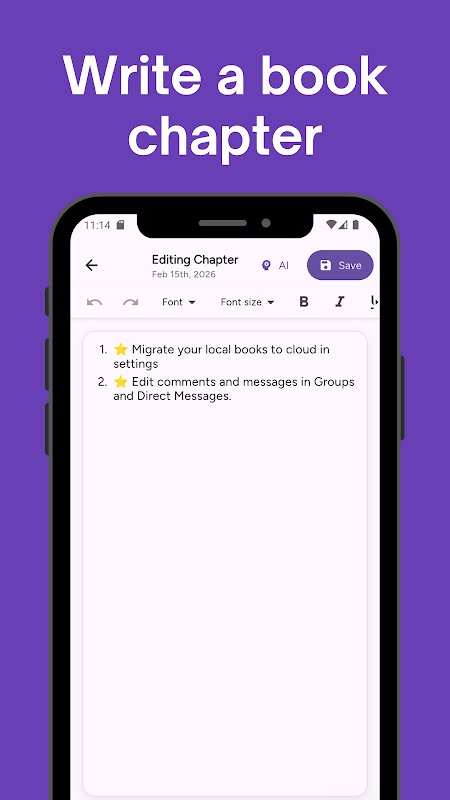 हमारे सहज और उपयोगकर्ता-अनुकूल इंटरफ़ेस के साथ सहजता से अपनी स्वयं की पुस्तक बनाएं। चाहे आप लेखक हों, छात्र हों, या कोई ऐसा व्यक्ति जो अपने विचारों को व्यवस्थित करना पसंद करता हो, यह ऐप आपकी पुस्तक को सहज तरीके से प्रारूपित और संकलित करना आसान बनाता है। इसके सरल लेकिन शक्तिशाली डिज़ाइन के साथ, आप जटिल विशेषताओं से अभिभूत हुए बिना पूरी तरह से लेखन पर ध्यान केंद्रित कर सकते हैं। चाहे वह जर्नलिंग, उपन्यास लेखन, या नोट्स रखने के लिए हो, यह ऐप सभी के लिए एक सुखद और उत्पादक लेखन अनुभव सुनिश्चित करता है। आज ही अपनी उत्कृष्ट कृति बनाना शुरू करें!