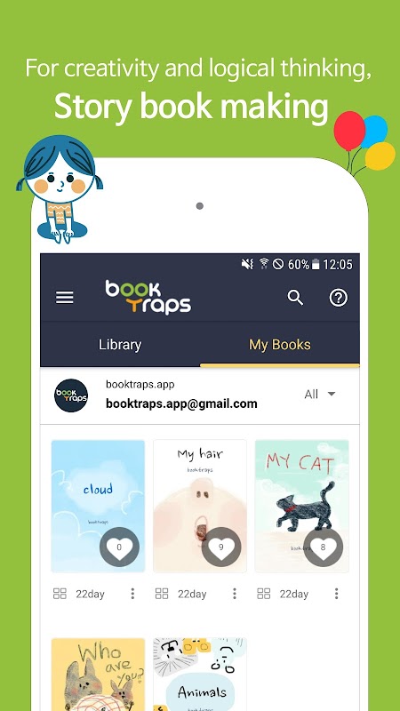 बुकट्रैप बच्चों को विज्ञापनों के बिना अपनी कहानियों के साथ किताबें बनाने में सक्षम बनाता है।
