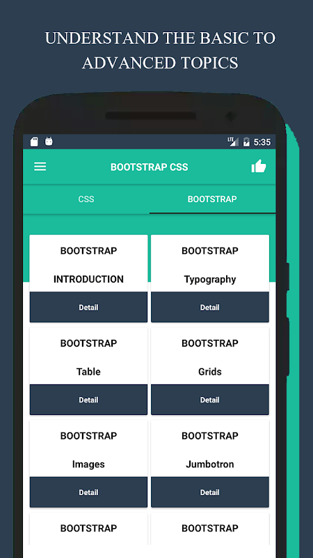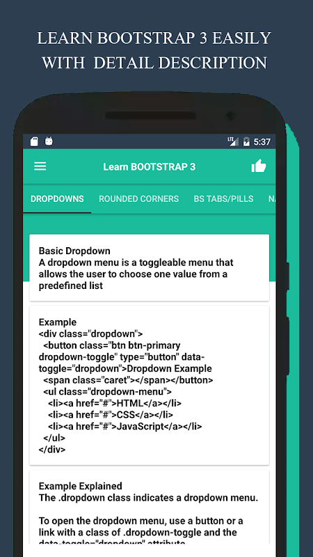Bootstrap is the most popular HTML, CSS, and JavaScript framework for developing responsive websites.In this app you will learn about Bootstrap 3 with the help of syntax code.And also this bootstrap tutorial app contains many of bootstrap code examples which give you the clear idea that how to create a bootstrap page.