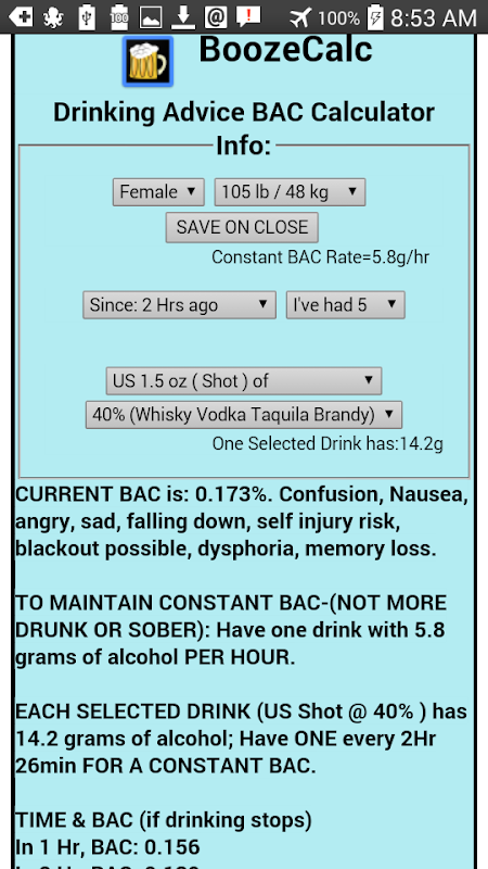 BoozeCalc uses only math, not measurements to determine Blood Alcohol Content. Though results seem to be "spot on" for the majority. It can be completely inaccurate for some people's physiologies. Since it is not a "measured" value it cannot be relied upon for accuracy in vital situations. Use BoozeCalc only for entertainment purposes only and never as a precise instrument for making important decisions such as should I drive or not. If in doubt, call a cab.