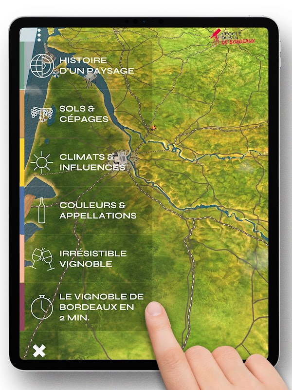 इस एप्लिकेशन का उपयोग करने के लिए, बोर्डो वाइनयार्ड मानचित्र को कागज या डिजिटल प्रारूप में रखना आवश्यक हो सकता है (आपके कंप्यूटर पर भी डाउनलोड करने योग्य: https://www.carte-enrichie.com/bordeaux-immersive-map/)।