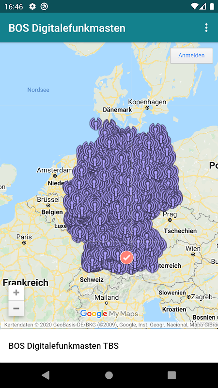 एप्लिकेशन जर्मनी में टीओएस डिजिटल रेडियो मास्टर्स टीबीएस के साथ एक नक्शा दिखाता है।