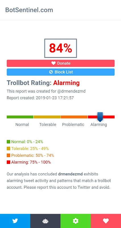 Bot Sentinel is an easy-to-use app that helps identify trollbot and untrustworthy Twitter accounts in real-time. Bot Sentinel uses machine learning and artificial intelligence to classify suspicious Twitter accounts, and then our app displays a visible warning when viewing accounts with a high trollbot rating. Users can also manually check Twitter accounts and use our other free tools to help combat trollbots. Note: You can manually check accounts quickly by clicking the cog icon under every tweet.
