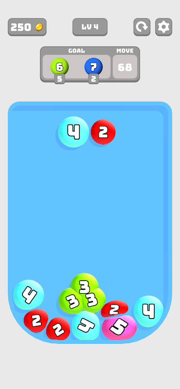 गेंद के जोड़े गिराएँ, जब समान स्तर के तीन जोड़े मिलते हैं तो उन्हें उछलते और विलीन होते हुए देखें।