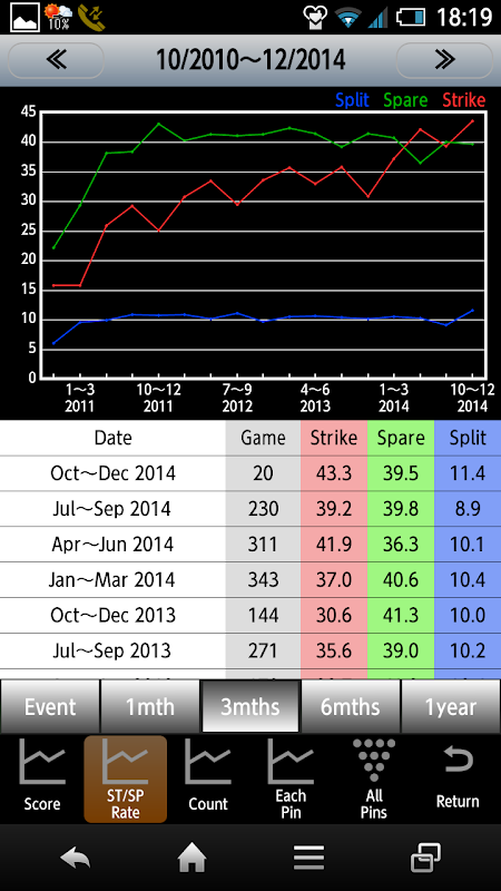 (स्कोर, हड़ताल / स्पेयर दर, गिनती, प्रत्येक पिन, सभी पिन) रेखांकन
