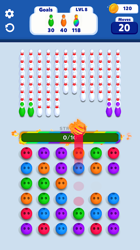 गेंदों को एक साथ जोड़कर सभी पिनों को गिराने का प्रयास करें!