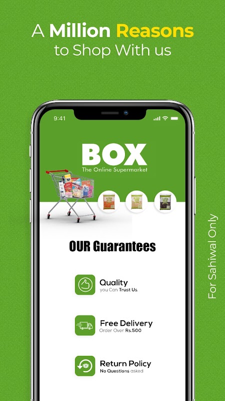 BOX एक ऑनलाइन किराना डिलीवरी सेवा है और वापसी और धनवापसी नीति के साथ आपके दरवाजे पर कम कीमतों पर 5000+ गुणवत्ता वाले उत्पाद (किराने, फल और सब्जियां) वितरित करती है और उसी दिन 500RS न्यूनतम ऑर्डर मूल्य के साथ मुफ्त होम डिलीवरी निर्धारित करती है।
