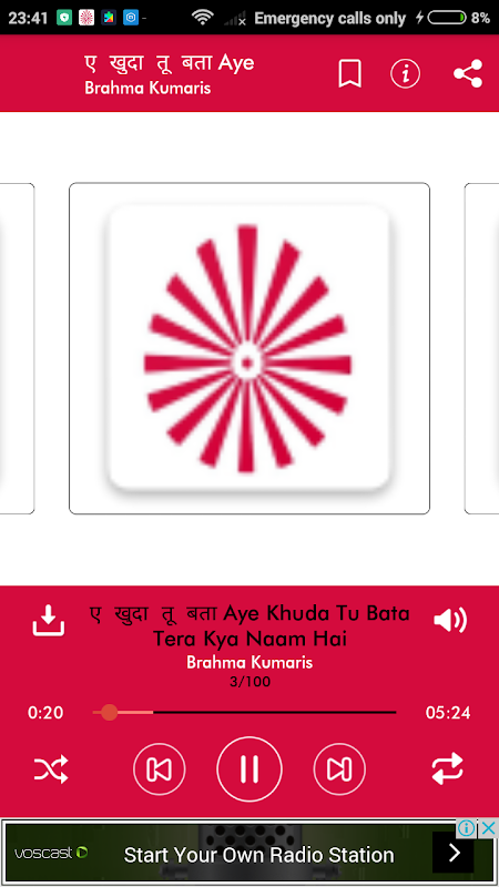 This application contains top 100 selected songs from a collection of 3000 Brahma Kumaris songs. Install this app for divine experience of peace, health, wealth & happiness. Brahmakumaris World Spiritual University which is a spiritual institution focused on self-transformation through spiritual education & reflective practices. Made with ❤ by Brahmakumaris follower for other followers to help through spiritual transformation process. This application is absolutely free to download and share songs.