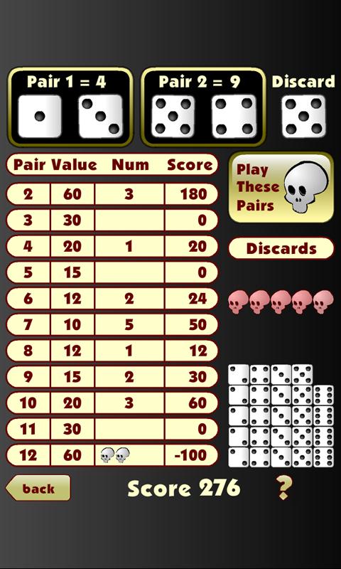 पहले तो यह गेम एक साधारण "गलत रोल न करें" प्रकार का गेम लगता है। लेकिन इसमें उससे कहीं ज़्यादा है। आपको अपने त्यागे हुए पासों के साथ-साथ जो जोड़े आप बना सकते हैं, उन्हें भी सावधानीपूर्वक प्रबंधित करने की आवश्यकता है। यह शुरू में थोड़ा निराशाजनक लगता है, क्योंकि आपको कभी भी सकारात्मक स्कोर नहीं मिल सकता है। लेकिन थोड़ी सी योजना बनाकर, आप यह कर सकते हैं।