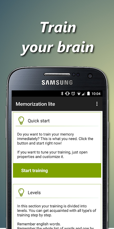 आप उत्कृष्ट स्मृति करना चाहते हैं? यदि आपका जवाब यदि हाँ, तो अध्ययन आवेदन के लिए हमारे मस्तिष्क व्यायाम आप के लिए आवश्यक है। आप स्मृति को प्रशिक्षित कर सकते हैं। आप अपनी याददाश्त को प्रशिक्षित कर सकते हैं। आप को याद करने की क्षमता में सुधार होगा। हर व्यायाम याद रखने के लिए तस्वीर के साथ 10 शब्द हैं। को देखने के बाद यह आपको एक सही क्रम में सभी शब्दों को पुन: पेश करने के लिए आवश्यक हो जाएगा। इस एप्लिकेशन को अध्ययन के लिए मस्तिष्क व्यायाम शामिल हैं।