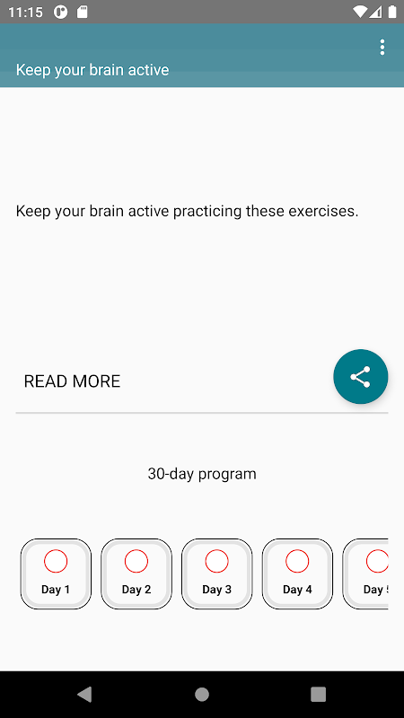 इस एप्लिकेशन में आप 30 दिनों तक मस्तिष्क के व्यायाम कर सकते हैं, जिनका उद्देश्य हमारे मुख्य संज्ञानात्मक कौशल, जैसे कि ध्यान, धारणा, अल्पकालिक स्मृति, समस्या समाधान, संपीड़न को उत्तेजित करना है। आपको अन्य के अलावा, मनोरंजन गतिविधियों का एक समूह भी मिलेगा जैसे कि चित्र पहेलियाँ, संगीत पहेलियाँ, शब्द खेल, मिलान गणित खेल, शब्द स्क्रैम्बल, अक्षरों को अनस्क्रैम्बल करना, कूल गणित खेल।