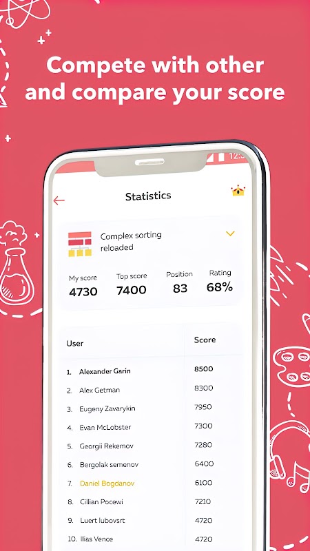 अंदर आप अपने मस्तिष्क प्रशिक्षण के आंकड़े भी पाएंगे और अपने प्रतिद्वंद्वियों की उपलब्धियों को देखेंगे। प्रतिस्पर्धा करें और अपने आप को स्टैंडिंग के शीर्ष पर खोजें।