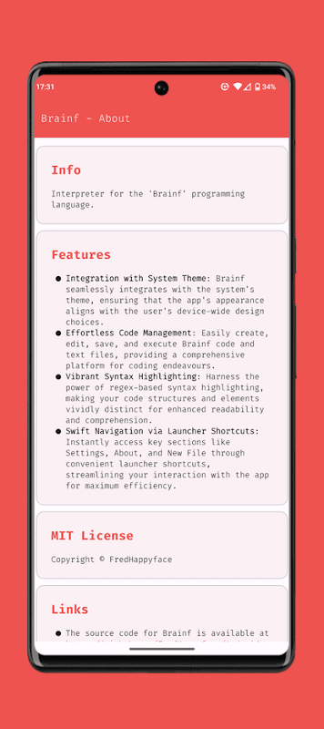 MIT लाइसेंस (अधिक जानकारी के लिए लाइसेंस देखें https://github.com/FredHappyface/Android.Brainf/blob/main/LICENSE.md )
