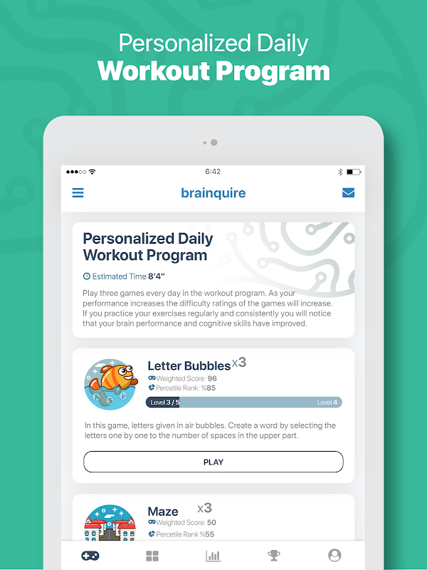 विभिन्न श्रेणियों (मौखिक, मात्रात्मक, दृश्य, तार्किक, स्मृति और ध्यान) में गेम और एप्लिकेशन का उपयोग करके संबंधित क्षेत्रों में अपनी क्षमताओं को बेहतर बनाएँ और उनकी निगरानी करें।