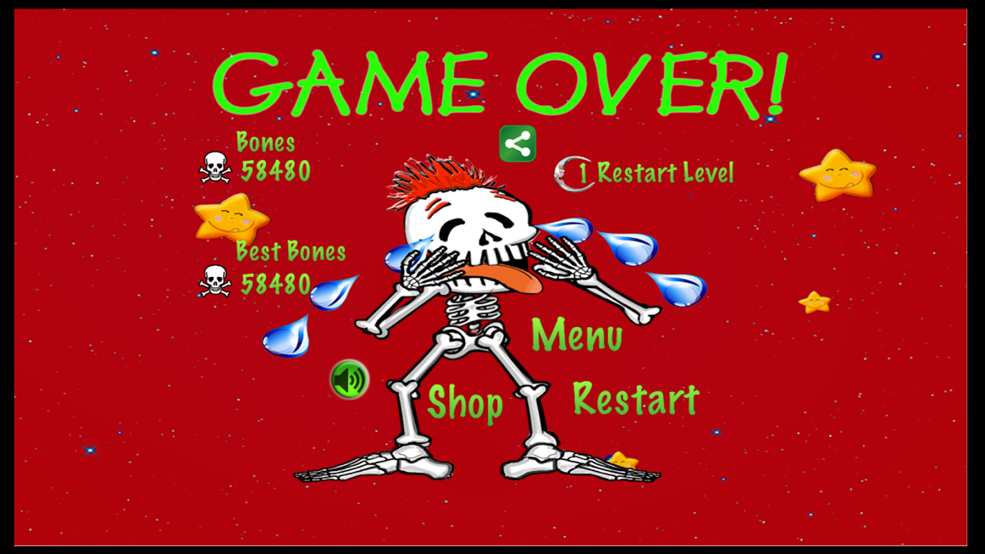 Breaking Bones is fast and fun with entertaining, original artwork and animation. The blue rocket ship hero shoots a fiery skull by tapping the red fire button to defeat a horde of skeleton monsters and obstacles while gathering lots of treasure. Find different power-ups on each level to help gather more riches - The red hot air balloon makes the hero invincible! Just tap the yellow jump button to make the hero fly through the mayhem and gather as much loot as possible to achieve high scores and win the game!
