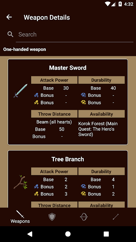 - हथियार विवरण: विशिष्ट हमले की शक्ति, स्थायित्व और उनके संभावित बोनस विशेषताओं के साथ सभी हथियारों, धनुष और ढाल (अमीबा अनलॉक सहित) की सूची
