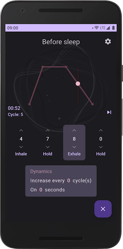 एप्लिकेशन में तैयार श्वास पैटर्न शामिल हैं, लेकिन आप सांस के चरणों के सही मूल्यों के साथ अपनी तकनीक भी बना सकते हैं।
