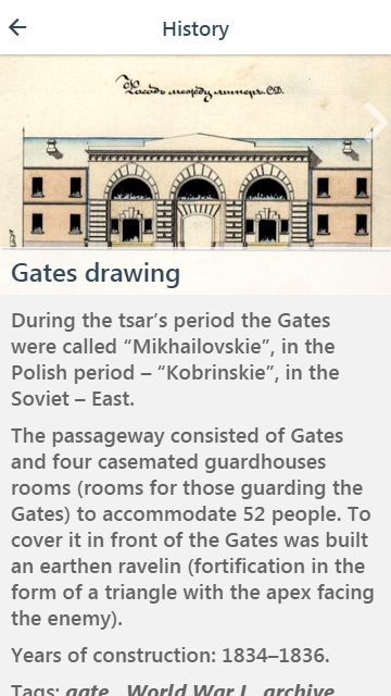 The application will introduce the objects of the historical-cultural heritage of the fortress of XIX century, monuments and museums of the Memorial Complex “Brest Hero Fortress” to the user.