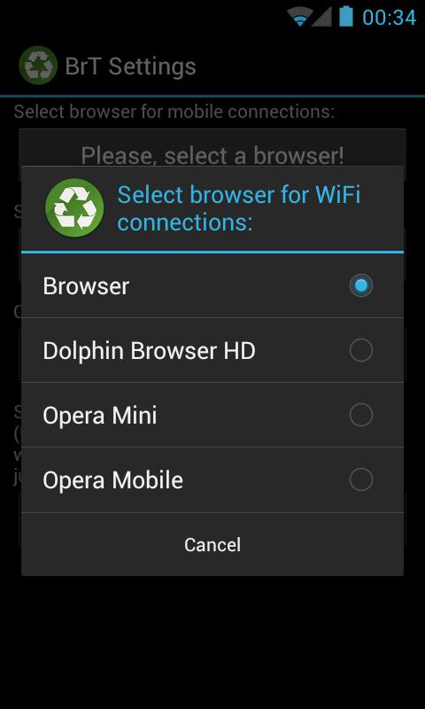 Browser Toggle simply starts one of your preselected Browsers depending on the kind of your current connection (WiFi or Mobile).