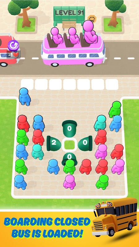 यात्रियों को अलग-अलग रंगों से चिह्नित किया गया है, और बसों के रंग मिलते-जुलते हैं। आपका लक्ष्य किसी यात्री पर क्लिक करना और उन्हें बस में चढ़ाने से पहले प्रतीक्षा क्षेत्र में रखना है। एक बार जब तीन यात्री बस में बैठ जाते हैं, तो बस रवाना हो जाती है। हालाँकि, चुनौती यह है कि आपके पास सीमित संख्या में प्रतीक्षा स्लॉट उपलब्ध हैं। इसका मतलब है कि आपको प्रत्येक चरण में सावधानीपूर्वक विचार करने की आवश्यकता है कि किस यात्री को चुनना है, क्योंकि बस में भेजे बिना प्रतीक्षा क्षेत्र में बहुत अधिक यात्रियों को रखने से आप फंस सकते हैं। आप उन्हें प्रतीक्षा क्षेत्र में ले जाने के लिए लाइन में केवल सबसे आगे के यात्रियों का चयन कर सकते हैं, इसलिए रणनीतिक योजना बनाना महत्वपूर्ण है।