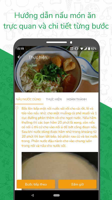 Cung cấp công thức nấu ăn và hướng dẫn chi tiết các bước giúp thực hiện món ăn một cách trực quan và chi tiết nhất. Danh sách món ăn liên tục được cập nhật từng giờ với các thể loại đa dạng. Với các tính năng hướng dẫn và theo dõi mua nguyên liệu, hướng dẫn chi tiết từng bước thực hiện, bấm giờ nấu giúp thực hiện món ăn một cách chính xác.