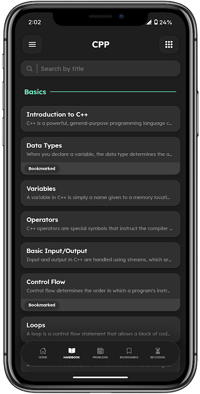 इंटरैक्टिव कोड एडिटर, हैंडबुक और अभ्यास समस्याओं का उपयोग करके C++ कोड करना सीखें।