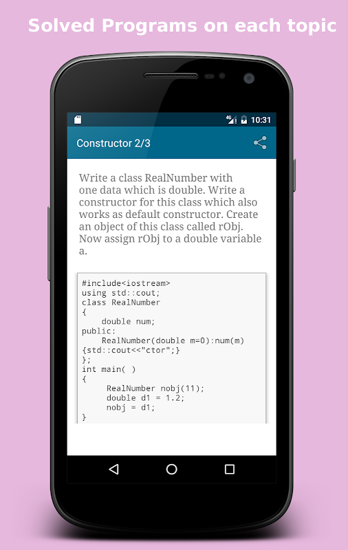 You can read about the concepts of C++, test your knowledge with quiz and read complete programs. Don't worry if you get your answers wrong. The app gives explanations too.