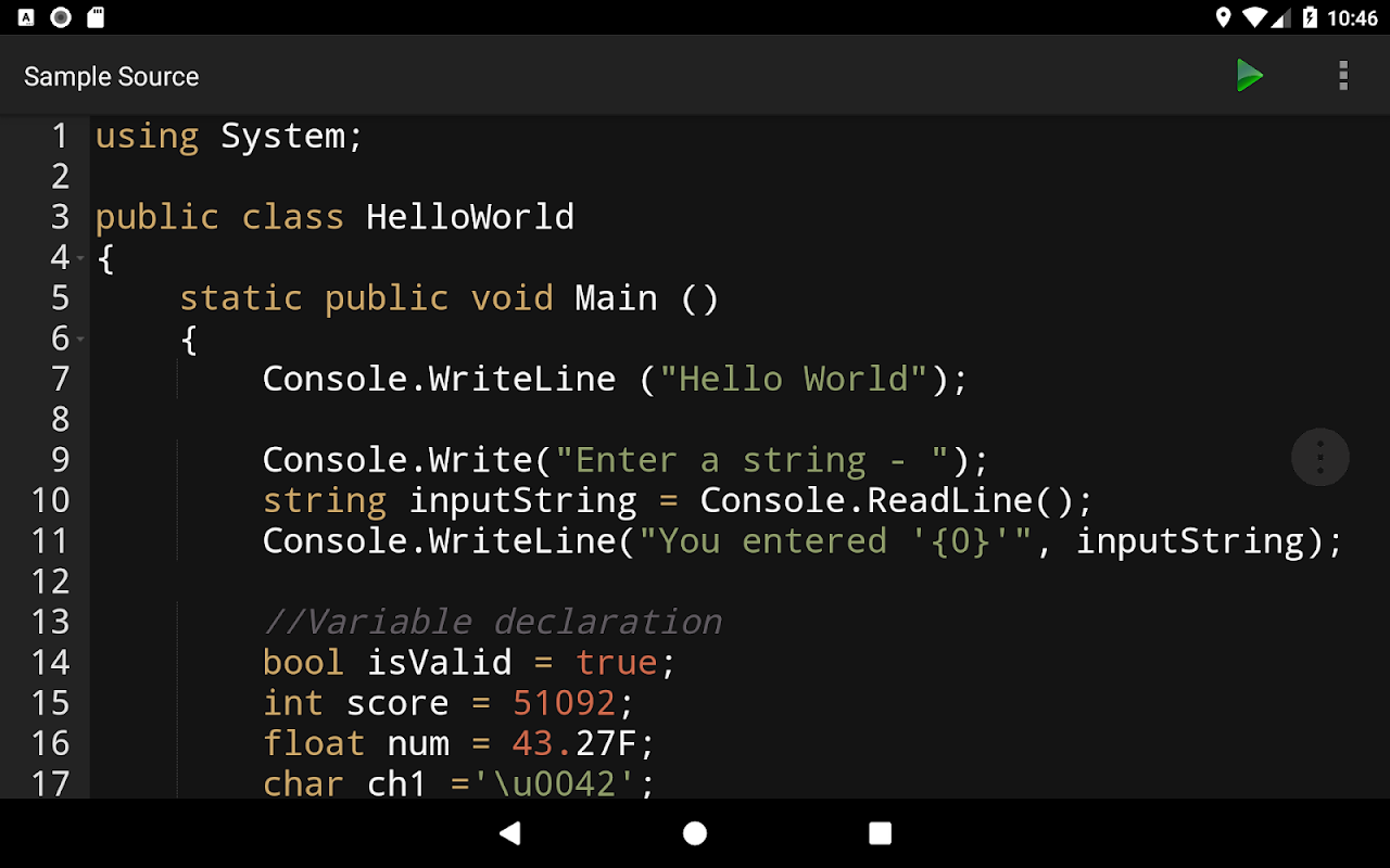 अपने डिवाइस पर C # कोड लिखें! सीखने और कोड स्निपेट्स के परीक्षण के लिए आदर्श!