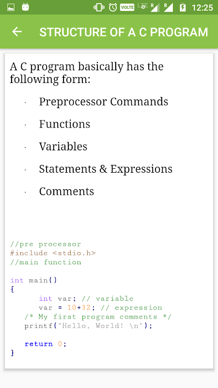* C programming concepts app contains C programming cheat sheet for quick revision.