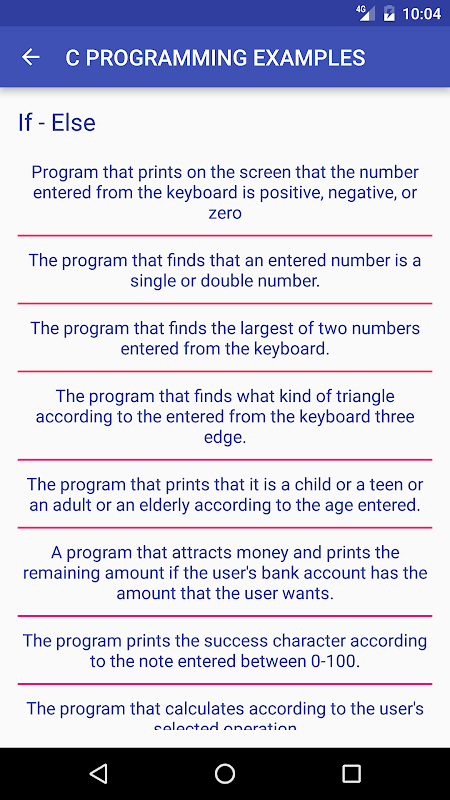 C PROGRAMMING SAMPLES is an application which is composed of C examples for those who are new to C language and those who want to improve themselves with examples. The application is separated by C subjects, many examples of each topic are available and this number will increase with new samples. Each sample screen output is absolutely available, you can experiment by yourself and check out the application from the screen. In practice, if you have a problem, wish, suggestion or something you see wrong, you can send an e-mail from "contact us" and an absolute return will be made. Application developers are university students, you can support by clicking on the ads. Optionally, the application will be developed for different software languages.