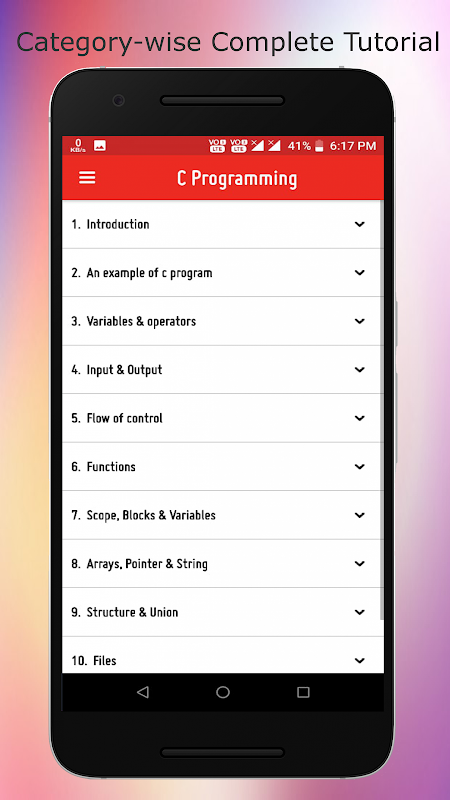 यह सी प्रोग्रामिंग एप्लिकेशन आपको अपने Android उपकरण में बुनियादी सी प्रोग्रामिंग नोट ले जाने के लिए सक्षम बनाता है। यह 100 + के बारे में सी कार्यक्रम में शामिल है।