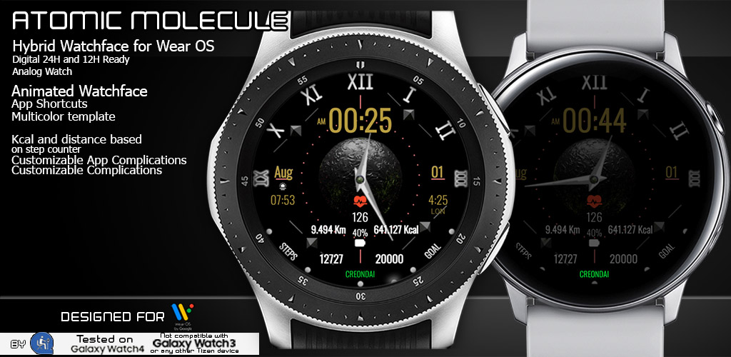 Creondai's Group द्वारा वियर OS के लिए परमाणु अणु हाइब्रिड वॉच। यह परमाणुओं और चुंबकीय मशीनों पर आधारित एक सुंदर एनिमेटेड वॉचफेस है।