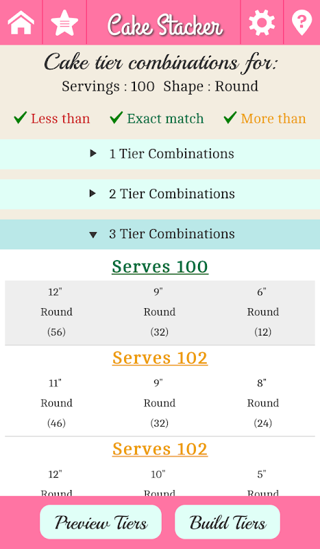 - कई केक आकार के साथ काम करता है और स्तरों की संख्या द्वारा क्रमबद्ध निकटतम परिणाम दिखाता है।