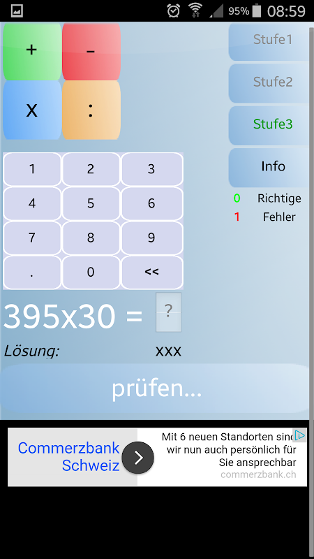 Diese Rechnen App dient zur Übung von Addierungsrechnungen, Subtrahierungen, Divisionen und Multiplikationen.