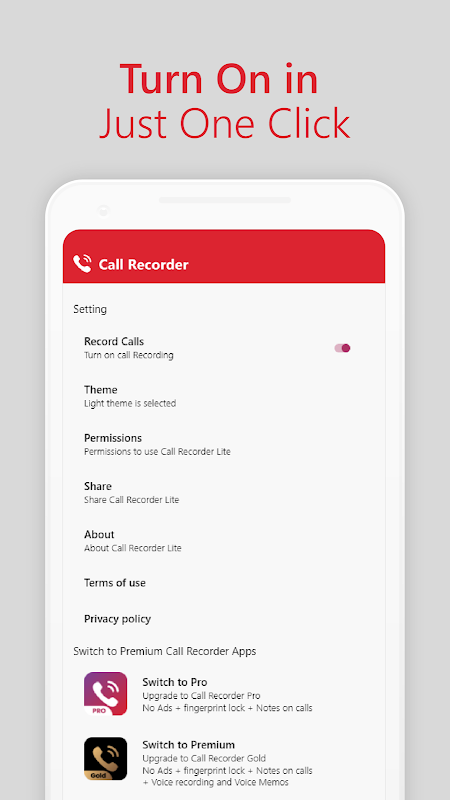 यह ऐप स्पष्ट रूप से फ़ोन कॉल रिकॉर्ड करने के लिए डिज़ाइन नहीं किया गया है। कुछ निर्माता गोपनीयता या कानूनी कारणों से फोन कॉल के दूसरे पक्ष को रिकॉर्ड करने की क्षमता को अवरुद्ध करते हैं। इसी उद्देश्य के लिए, ऐप फ़ोन कॉल के दौरान रिकॉर्डिंग को रोक देगा, लेकिन इसे सेटिंग्स में बंद किया जा सकता है। अपने स्थानीय कानूनों की जाँच करें और सुनिश्चित करें कि यह पहले आपके हैंडसेट पर काम करता है।
