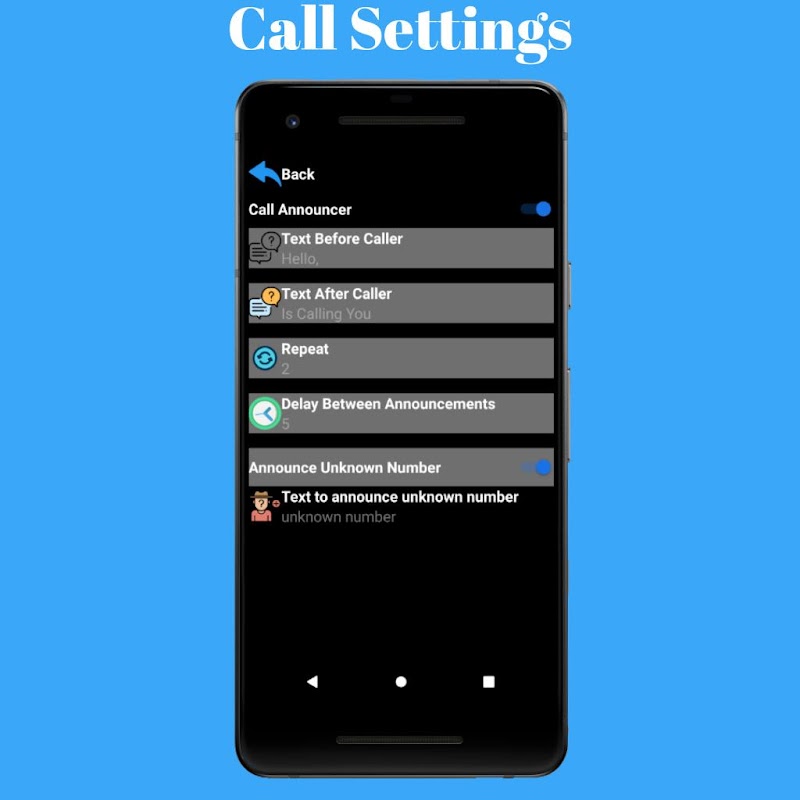 कॉलर नाम उद्घोषक स्पष्ट रूप से "इनकमिंग" कॉलर के नाम या एसएमएस भेजने वाले के नाम और संदेश की सामग्री का उच्चारण करने के लिए अंतर्निहित एंड्रॉइड टेक्स्ट-टू-स्पीच इंजन का उपयोग करता है।