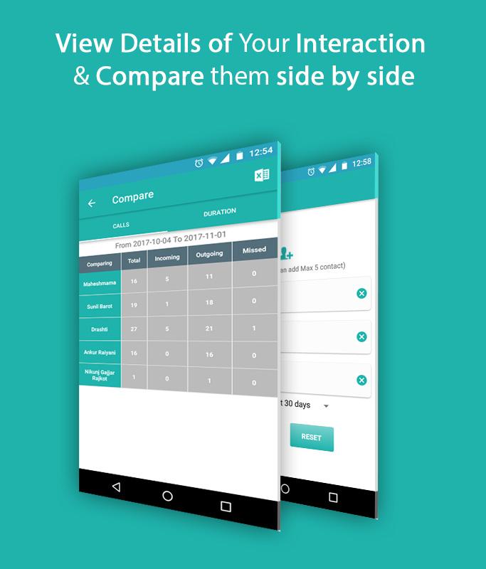 Pick Contacts from your phone book and view details of your interaction and compare them side by side. With Filter available, you can also Compare your interactions as per your required duration.