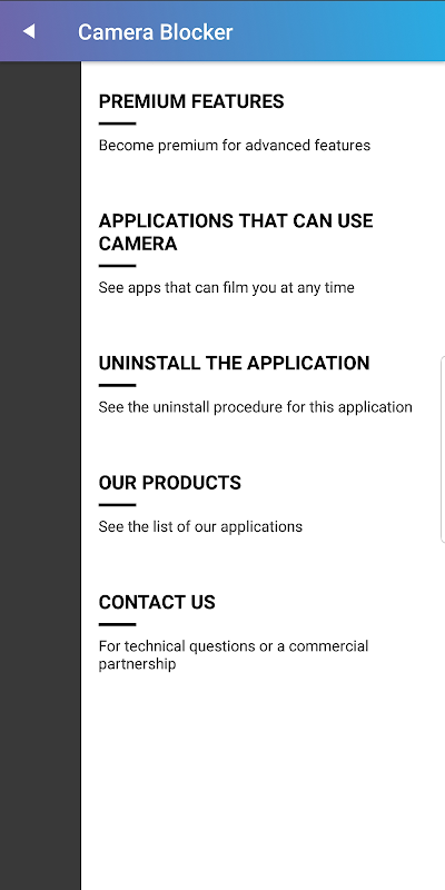 Camera Blocker is an application that allows you to have full control of the camera of your smartphone. Just choose from the two options "lock" or "unlock" so that the ability to shoot or take photos is impossible for all applications even those in the background. Thus Camera Blocker instantly allows you to keep control over all applications, protecting your privacy and blocking all possible access that can be used by any hacker. Thanks to Camera Blocker and the new data protection restrictions, you can rest assured! The area of the spy phones is over. Today enjoy a safe and secure life. We offer you the opportunity to choose a life with more discretion. Once you want to recover the use of your camera you just unlock the options and you will recover all the features of your phone. Camera Block does not make exceptions and acts on all phone applications.