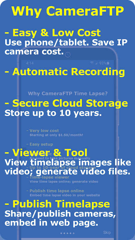 कैमराएफटीपी टाइमलैप्स ऐप स्वचालित रूप से तस्वीरें ले सकता है और उन्हें कैमराएफटीपी क्लाउड स्टोरेज पर अपलोड कर सकता है। आप ऑनलाइन टाइम-लैप्स वीडियो तैयार कर सकते हैं, या छवियां डाउनलोड कर सकते हैं और ऑफ़लाइन उच्च गुणवत्ता वाला टाइम-लैप्स वीडियो बना सकते हैं। आप टाइम-लैप्स कैमरा को प्रकाशित या साझा कर सकते हैं, या इसे अपने वेब पेज में एम्बेड कर सकते हैं।